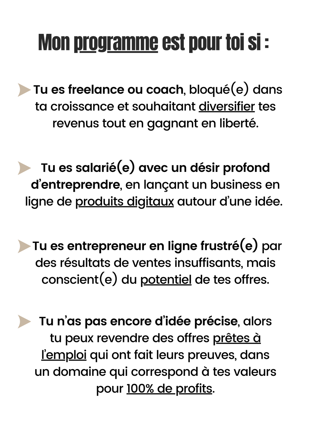 Absolument pas, revendre le cours est un choix qui t'appartient. Le cours digital en lui-même peut aider n'importe quel entrepreneur à digitaliser son business et créer un produit digital personnalisé sans pour autant se préoccuper de la vente du cours. Il t'apprendra des compétences qui te permettront de gagner de l'argent en ligne, qu'elle que soit ta passion.