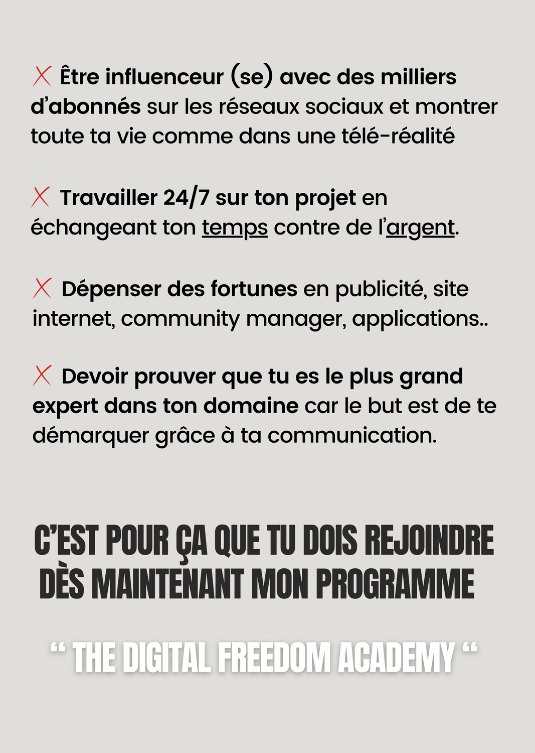 En accédant à la plateforme The Digital Freedom Academy tu rejoindras la communauté d'entrepreneurs sur laquelle tu pourras pauser toutes tes questions & partager tes victoires ! Tu auras également la possibilité de te connecter sur nos réunions Zoom mensuelles (4) pour évoluer sur ton Mindset, ton passage à l'action, ton organisation etc..